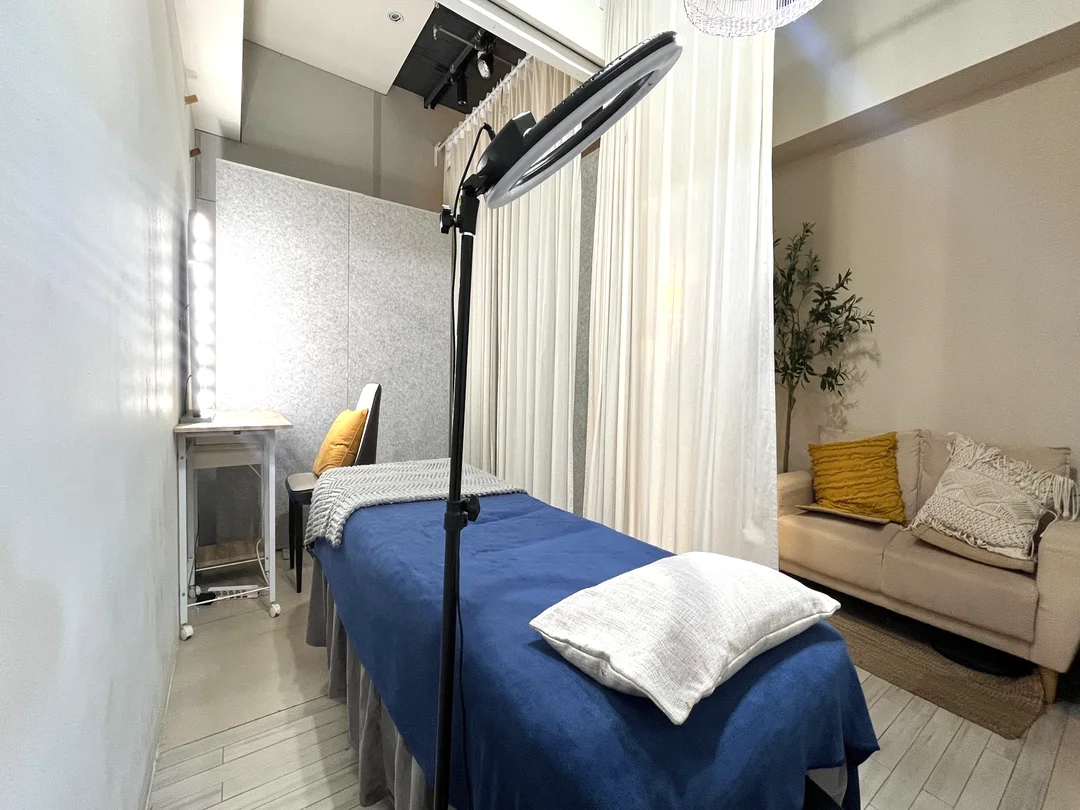 基本設備全數提供:美容床(全部上半身可調角度、全部頭有洞、部分整床4腳可調高度的會在房名特別標示整床可調高度)、Ra95+ 專業環形燈、鏡子、置物籃與自取的一次性床巾及枕巾。美業師只需攜帶個人服務材料,空間設備不需另外準備。